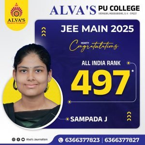 Alva’s PU College reaffirmed its academic excellence with remarkable results in the JEE Main 2025. Top achievers include Likha Tadap (AIR 435), Sampada J (AIR 497), Akash Pujar (AIR 895), and Punith Kumar B G (AIR 980). These exceptional national ranks highlight the effectiveness of Alva’s integrated coaching system, making it one of the best colleges for JEE coaching in Mangalore. With expert faculty and focused preparation for NEET, JEE, and KCET, Alva’s ensures students gain the competitive edge needed to succeed in national-level entrance exams.